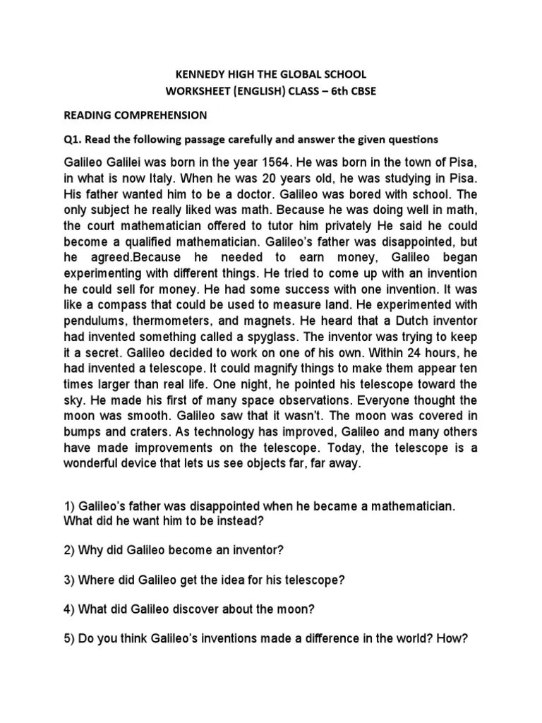 Galileo Reading Comprehension Worksheet : 1 -